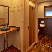 一階は白木をそのまま見せ、二階はこい茶色に着色し古民家風イメージで仕上げてみました。
