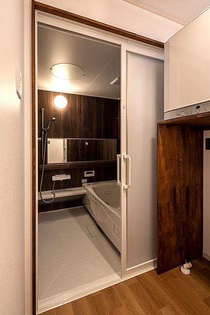 シンプルな空間を演出するために、壁にスライドする収納スペースを作り食器棚などを収納しています、また 冷蔵庫や食料品はバックヤードに収納しています。